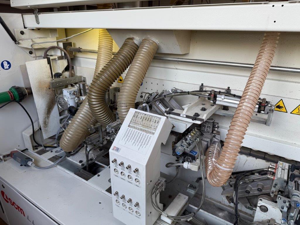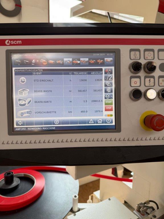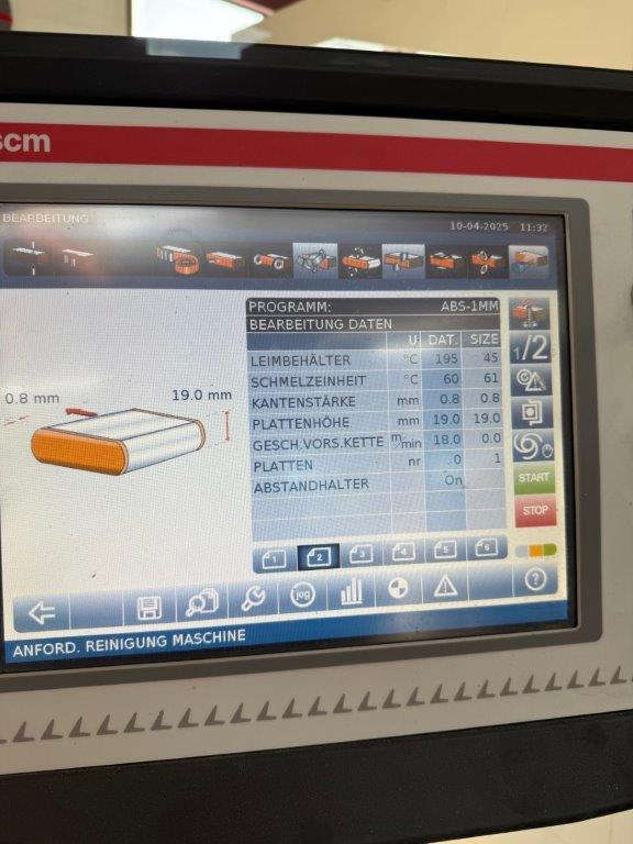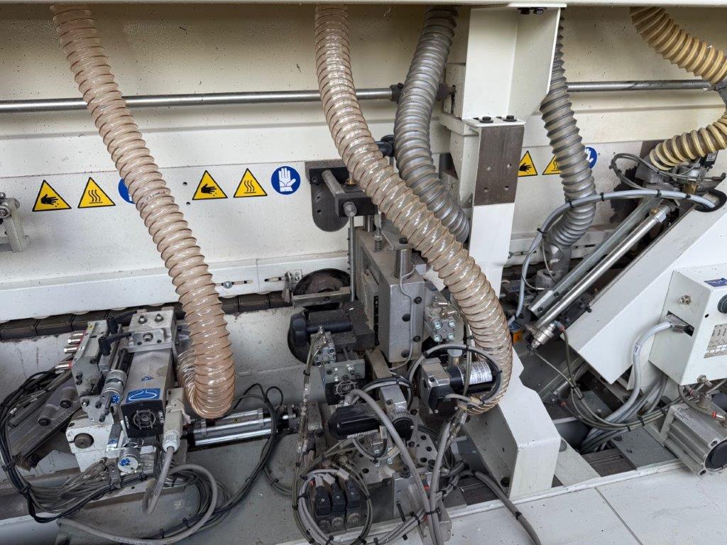 Rok produkcji 2012 Grubość elementu 60 mm Grubość krawędzi 8 mm Prędkość posuwu 18 m/min Kabina dźwiękoszczelna Tak Zbiornik kleju Tak oryginalny nowy moduł sterujący sterowanie dotykowe z ekranu (10 cali) wysokość sterowana ręcznie z pulpitu płyn antyadhezyjny frezy diamentowe do 60 mm + zestaw wymiennych ostrzy 4-osiowa frezarka sterowana ręcznie z pulpitu Cięcie poprzeczne dwie jednostki owijające skrobak do profili cyklina płaska polerki