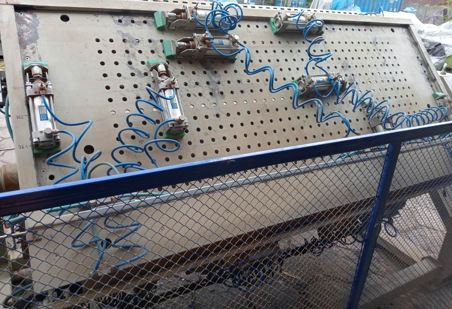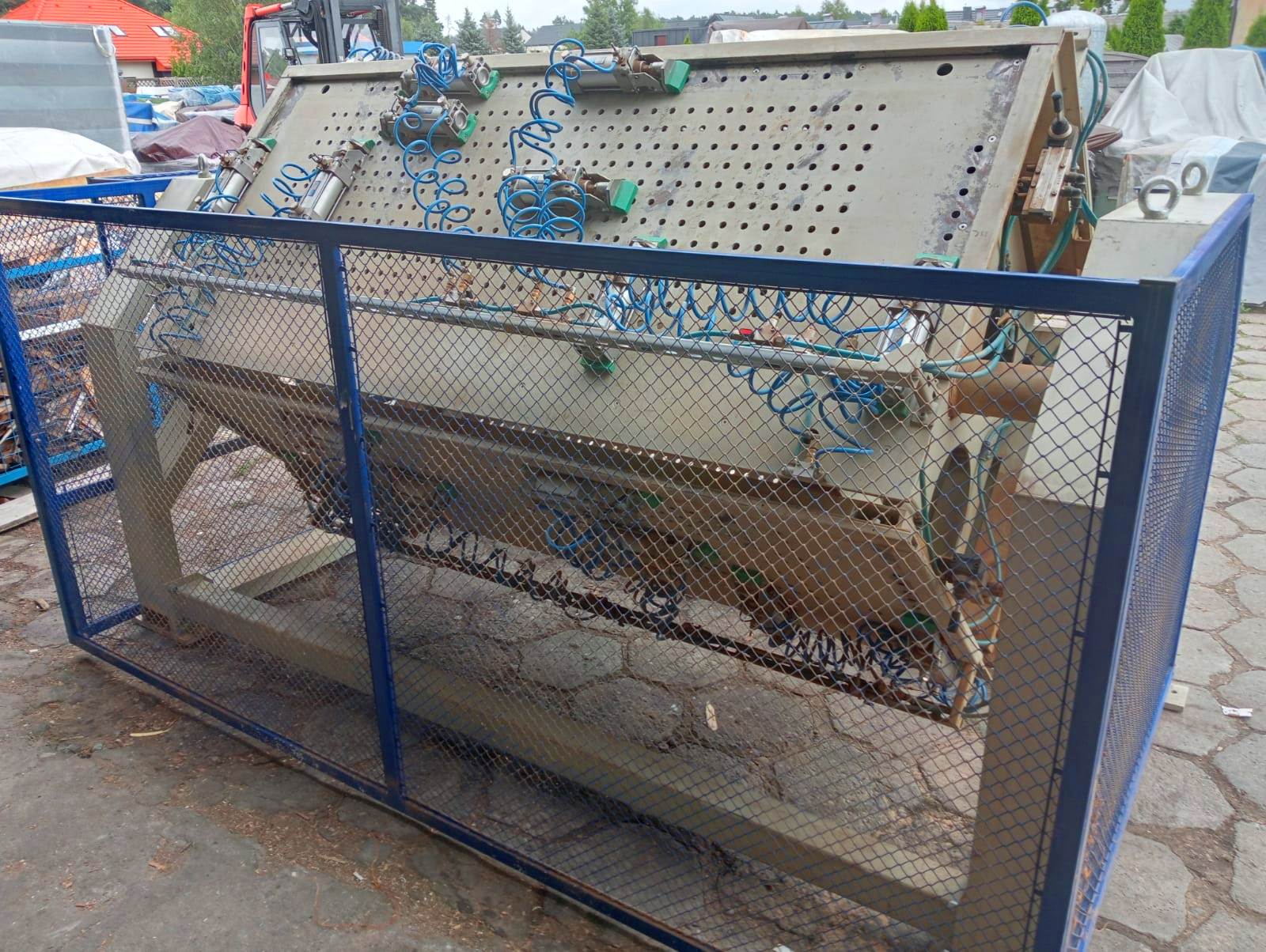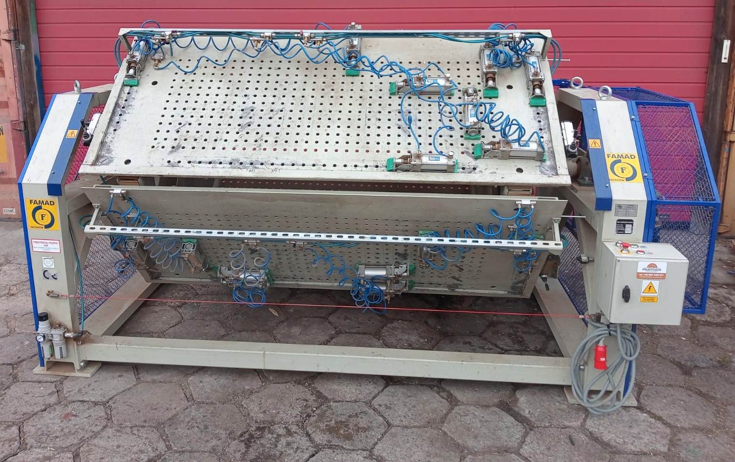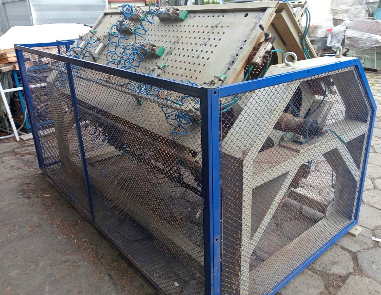 Pneumatyczny obrotowy ścisk do montażu frontów meblowych – OSMF umożliwia mechaniczny montaż frontów meblowych z listew MDF w technologii klejenia(łączenia) na kołki. Ścisk wykonany jest w formie czteropolowej ramy obrotowej, osadzonej na dwóch wspornikach. Na sitowej ścianie każdego z pól umieszczono osiem docisków pneumatycznych umożliwiających montaż dwóch frontów. Pracą siłowników sterują dwa zawory rozdzielające, umieszczone na każdym polu. Po załadowaniu pola nowym materiałem (frontem) zaciskamy sekcje i obracamy ramę obrotową o następne pole.
